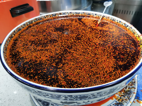 牛肉面的灵魂——油辣子,辣度不高,香气四溢。