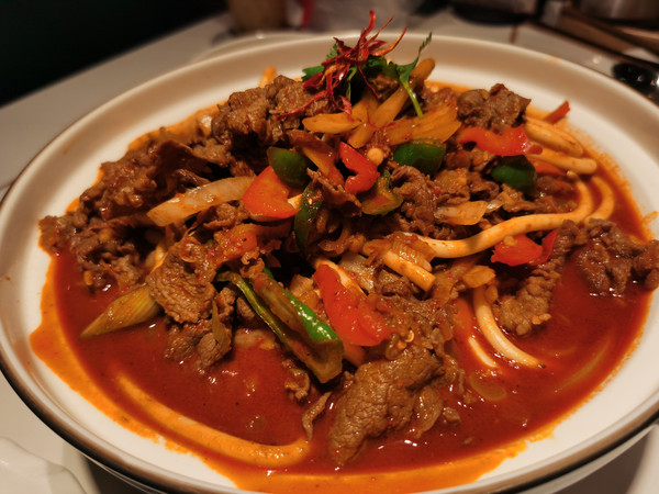 炒牛犊肉,也是按斤卖的,一斤的牛肉已经很多了。配菜里的拉条子是一绝,Q弹无比的口感。