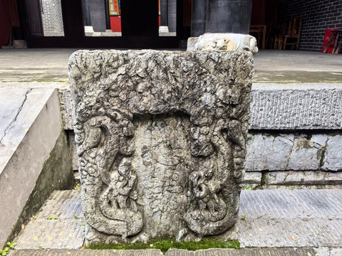 下图是书院门口的门槛石,是古时的遗物,上刻有鲤鱼跃龙门的图案,刻画了莘莘学子对锦绣前程的追求。