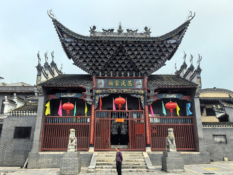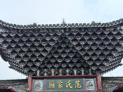 范氏家庙的房顶很有特色,有类似瓦当的多层椽木构成,木制瓦当上刻有花纹和文字。下左图的木制瓦当顶右边从上而下写的是“颂祖先千秋功绩”,左边从上而下写的是“庆后人世代荣昌”。