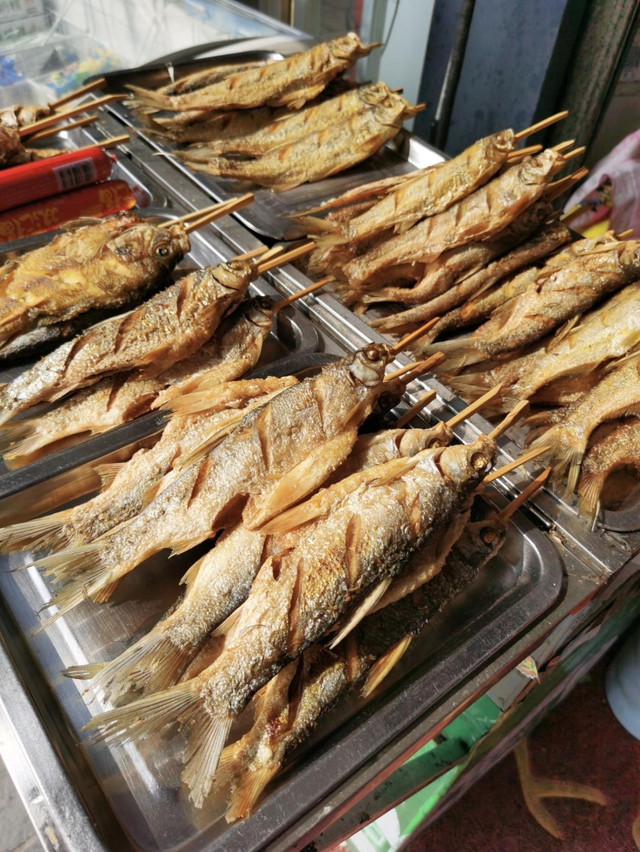 我们坐着摆渡车经过了一个站点。这里有很多小贩,大家都在卖力吆喝着,为的就是吸引一些游客来买东西。看到了好几个烤鱼的店,我们也买了几个。烤鱼非常劲道,就连鱼刺都烤的很酥脆了。在这里买了点零食,逛了逛,我们就去下一个景点了。