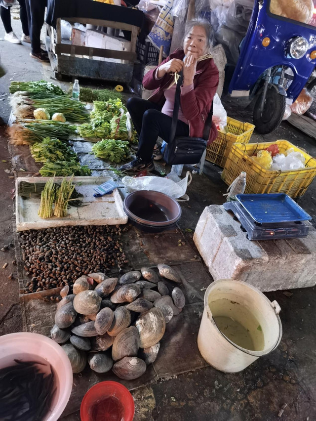 有的摊位在卖着各种新鲜的蔬菜。我若是住了一个可以炒菜的民宿,肯定要在这里买上一点菜,吃上一顿饭的。郴州的时令蔬菜和我们当地还是有些许不同的。