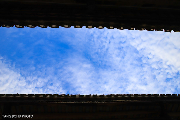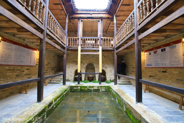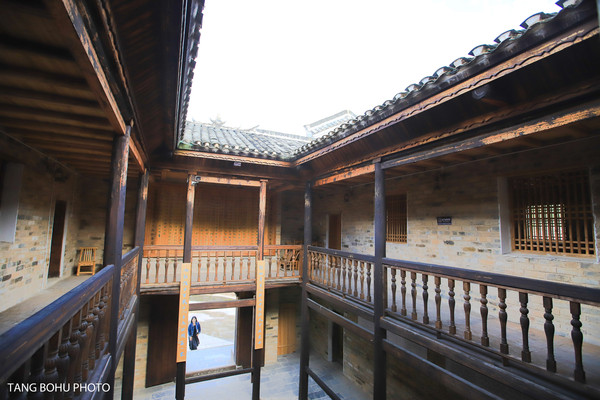 沿着楼梯走到两楼,抬头看蓝蓝的天空,木质结构的建筑还保留着以前那样结构,二楼的房间主要是用于展览用。在对面拐角处还有文字刻在木板上的记载。抬头就能看到蓝蓝的天空。这种天井的设计不仅可以让自然光线照进一楼,让整个屋子通透明亮。另外一个好处是通风。