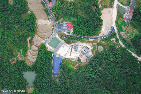从空中俯瞰整个景区四周被绿色植物包围着,再往一边看去田地里一片金黄色稻谷等待着收割,一幅美丽的乡村画卷呈现在眼前。