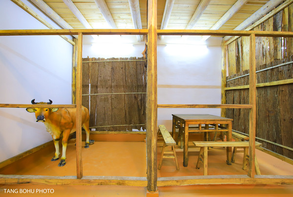 就在一楼的左侧有一间牛马归栏同过年的展厅,这个厅里展示的,是寿星家族的过年风俗,叫做牛马归栏同过年。是优良民俗、传统家风。牛马归栏,在很多地方除夕都有相同的说法和习惯。除夕晚上,家长在牛栏开铺同牛睡觉。人与牛马共度除夕的情景,目前所知,只有寿星园这个村庄,是初心未变、传统未改。