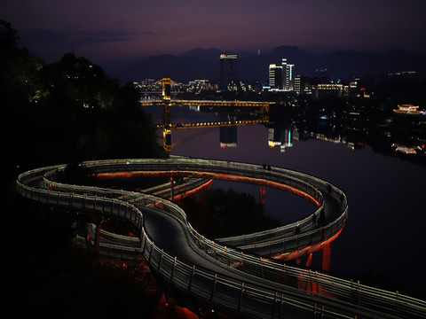 从凝翠阁下来走玻璃栈道。有很长的一条步行道,玻璃栈道只是一小段,自取鞋套走过去。在步行道上可以远眺索桥,沙县小城的夜景尽收眼底。