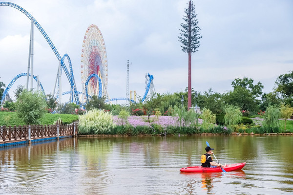在这里宽阔的水面可以让我们看到很多公园里面的娱乐设施远处大象雕塑和摩天轮都非常清晰的呈现出来,不远处的岸边,还有一处鼠尾草的花园,看起来是那么的美,看起来很有意境。