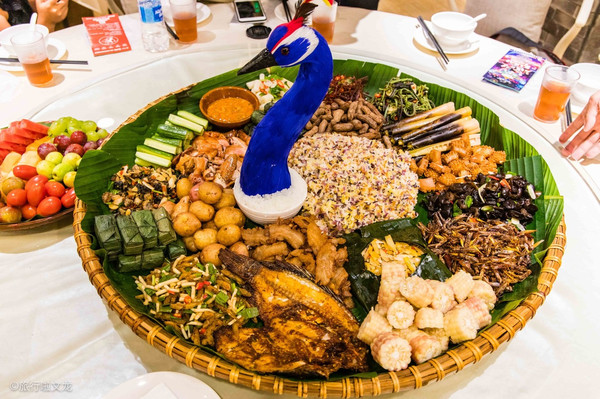 我来说一下孔雀宴这一款特色的菜式。其实它是煎炒烹煮各色菜肴组成的组成的。它的口感是口味上酸甜苦辣咸皆有,这道菜是仿照这孔雀开屏,色香味是面面俱到的。