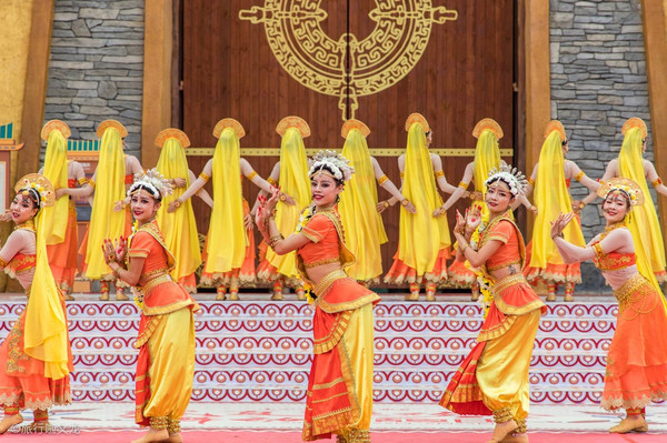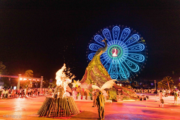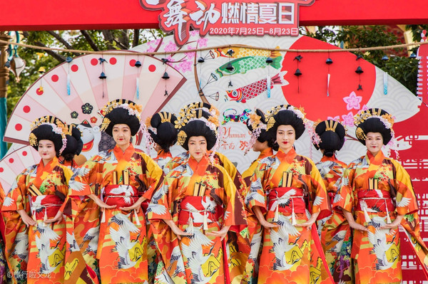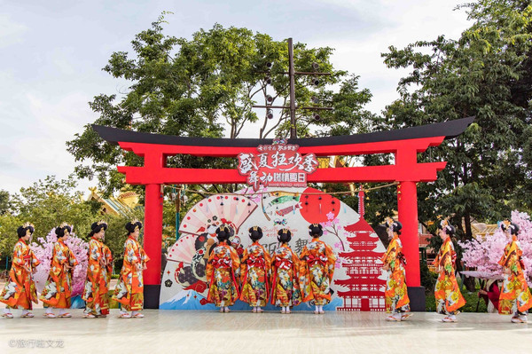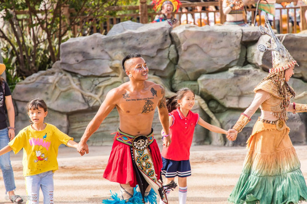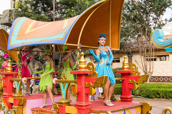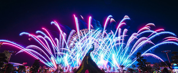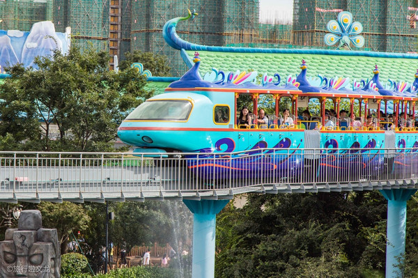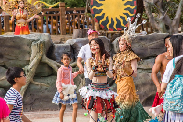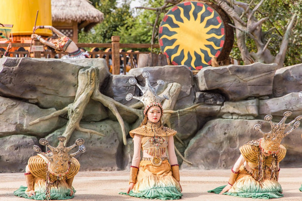 来这里赶上了盛夏狂欢季,外国乐队欢迎宾客穿上富有异域风情的服装,用不同的乐器演奏着欢迎曲,曲调铿锵有力。一个个也是精神抖擞和面带笑容。身后孔雀的造型依托着摩天轮,就犹如孔雀开屏一般。孔雀造型旁边有各种各样花开着,在视觉上产生了美感。