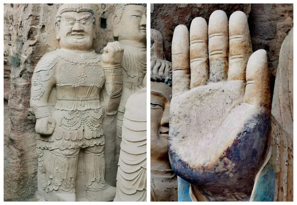 大佛左右两侧有二弟子(迦叶和阿难)、二菩萨(文殊和普贤)、二天王(北方多闻天王和西方广目天王),神态逼真,形象各异,塑造精致。南北两壁还有明代壁画,内容丰富,精妙绝伦。