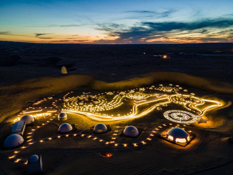 晚上黄色的灯光亮起,既像是在“火星营地”,又像是穿越“银河星系“。伴随这星光点点浪漫,逃离城市的喧嚣,给本是孤独感的沙漠和浮躁的内心,满满的温暖。
