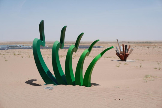 首先,我们来到了苏武沙漠里的“沙漠雕塑国际创作营”。来自全球32个国家和地区雕塑艺术家的117件沙漠雕塑作品落地大漠,如一颗颗璀璨的明珠,向世界展现着其无与伦比的艺术魅力。