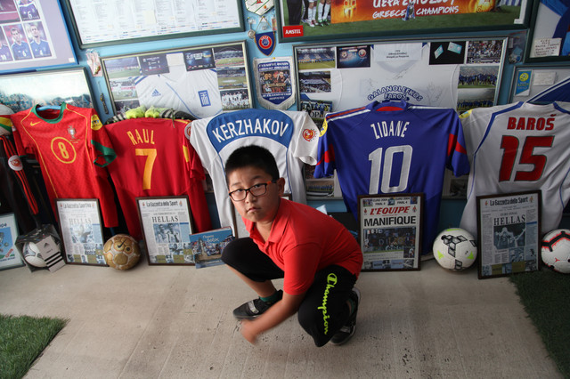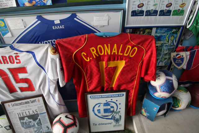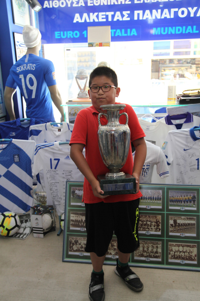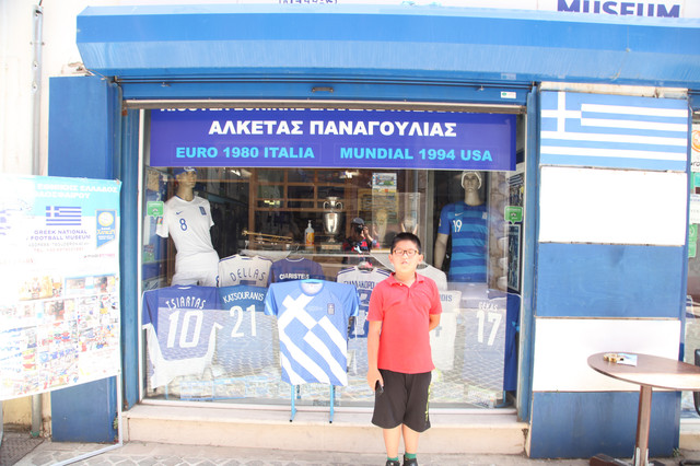 随后,我们开车来到古城墙,简单观瞻了一会,就开车去了希腊国家足球队纪念馆。这是一间不大的房屋建筑,门口有显目的招牌,里面有希腊国家足球队的队服以及2004年希腊国家队夺得欧洲杯的全体队员合影,那也是希腊国家足球队跨越历史的巅峰时刻。还有克里斯蒂亚诺.罗纳尔多(C罗,也是Keith最崇拜的偶像巨星)年轻时期穿的17号球衣,以及阿根廷球星梅西、法国球星齐达内、葡萄牙球星劳尔、菲戈等大牌球员的球衣,Keith还亲自捧起了那具希腊最骄傲的欧洲杯奖杯并合影。