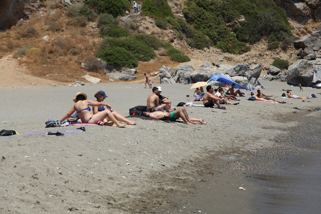 粉色沙滩上,游客云集,一点不像是疫情期间。我们一直玩到下午三点多,大家才准备回去。回程路上,顺路去爬了雅典娜女神崇拜的起始地——阿吉亚.索菲亚岩洞,后来风靡希腊全国的雅典娜女神崇拜,就是源自克里特岛的这座岩洞中。