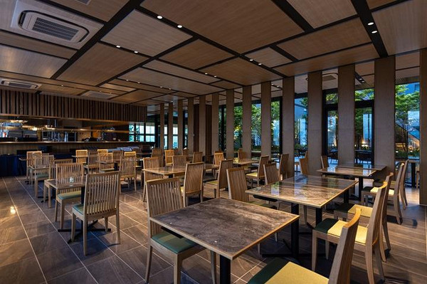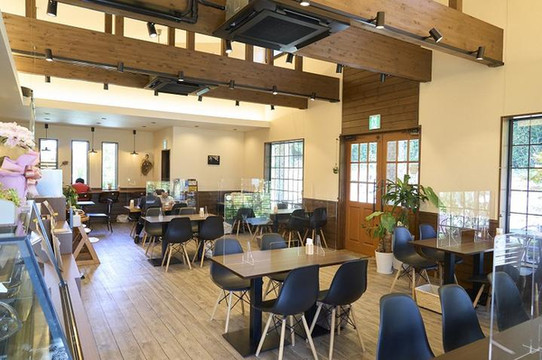 咖啡厅很宽敞,里面和外面都设置了很多座位,周围被绿色环绕着,玩累了坐在这里享受阳光和美食很舒服。