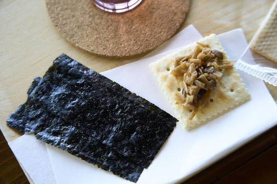 佐酒的小菜是海苔、苏打饼干和一点腌制小菜。