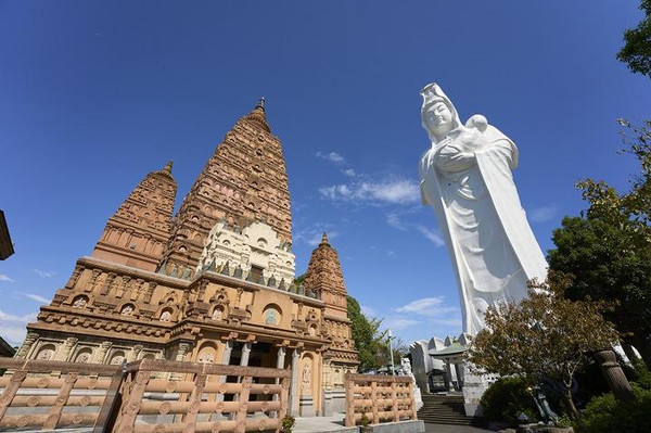 矗立在观音像旁边的棕色建筑是平和大佛塔纳骨堂。