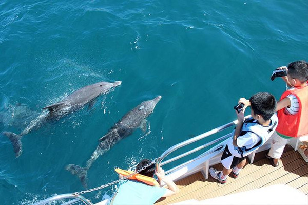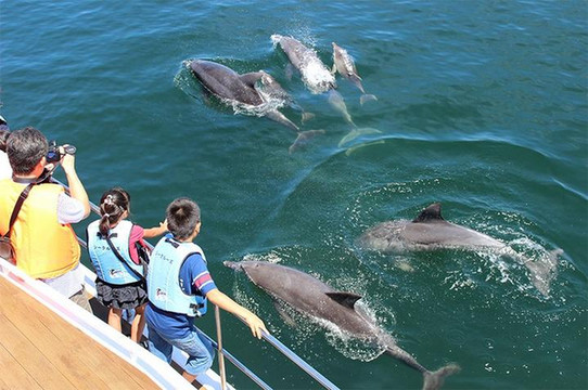 下午迎来了在天草最期待的项目:出海去观赏野生海豚!在天草周边海域,生活着约200头东方宽吻海豚,数量非常多,所以在天草邂逅海豚的几率超过90%!这里几乎全年都可以观赏到野生海豚,其中春季和夏季是观赏海豚的最佳季节,还有机会看到出生不久的小海豚。大多数情况下,游客做快艇从港口出发,大约30分钟就能到达观赏点。