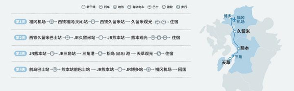 JR九州铁路周游券分为北部九州版(3日券、5日券)和南部九州版(3日券)、全九州版(3日券、5日券、7日券),大家可以根据自己规划好的行程进行购买和使用。这次推荐的行程依旧是北九州的四天行程(如下图),那么最适合的依旧是北部九州版的3日券。