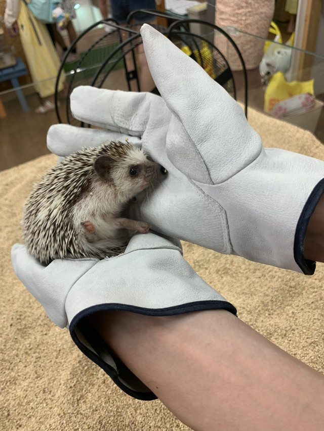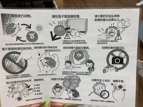 店里有跟小刺猬互动的提示,有中文版。注意事项还是比较多的, 比如不能把小刺猬拿出玻璃箱子玩等等。我觉得比较需要提前注意的是刺猬对气味敏感,我日常出门喷了香水,试了试小刺猬在我手里确实待不住,怕对它们健康不好,就赶紧放下不玩了,后面就都是看人玩咯。