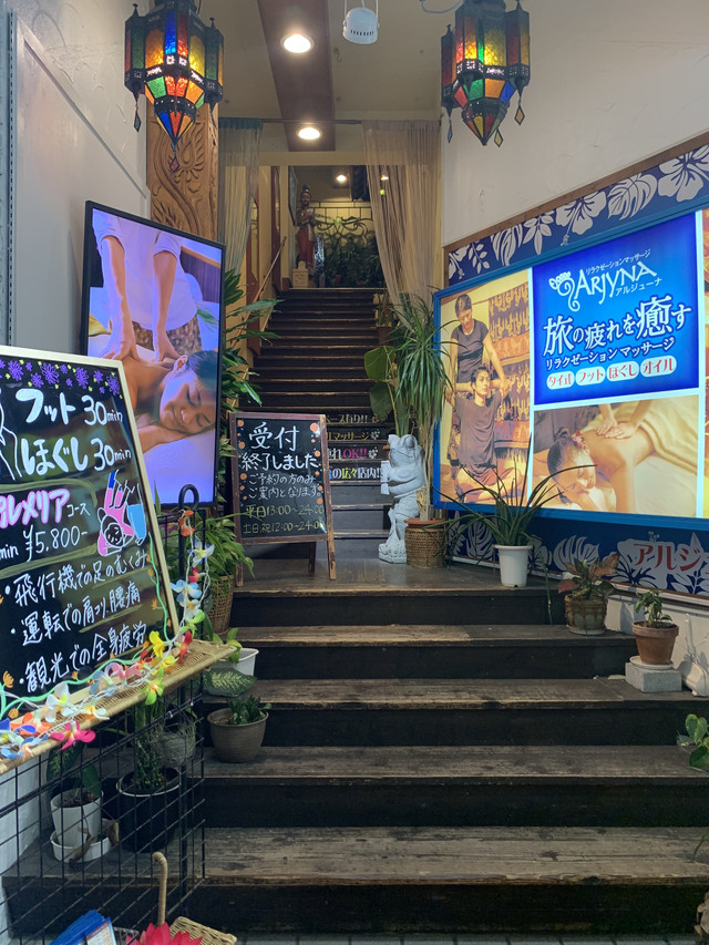 国际通里有好几家spa店,看着感觉都还不错。アルジューナ 平和 通り店门口的灯箱上有多种语言的价目表,各种项目价格写的清清楚楚。