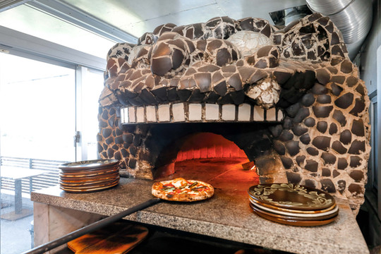 走上二楼,餐桌正对着落地窗,一阵香味扑鼻而来。这里最为饕客们津津乐道的,莫过于是以陶窑烘烤的特制披萨。