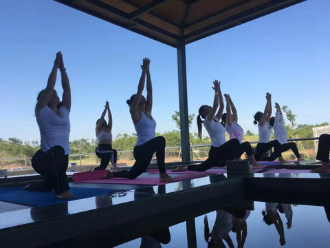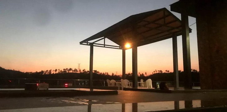 养生池旁配备有休息台供宾客休息观景