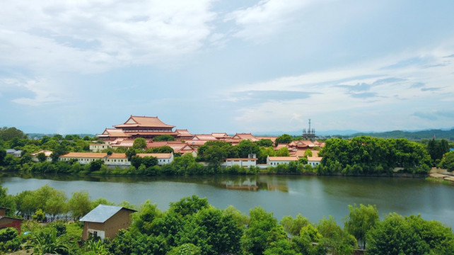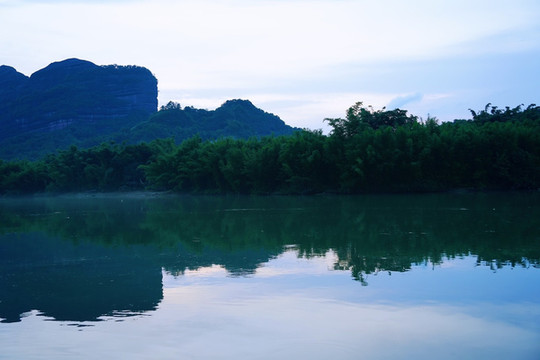 丹山携带着碧水,长空映照入波澜,周围的色调搭配协调,宛如动态的山水画卷。