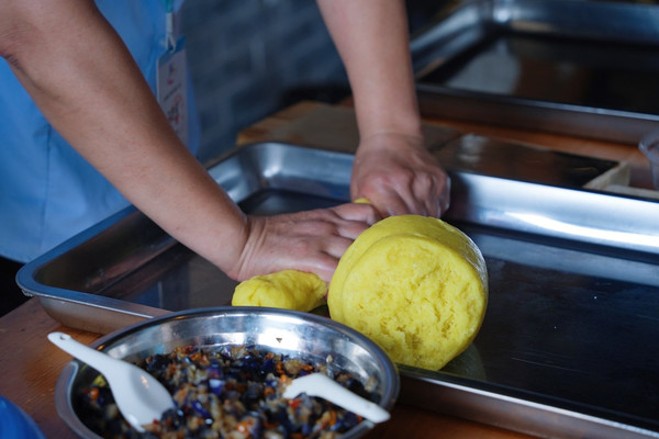 这里的美食可真是一绝,最有特色的 南雄 小吃——饺俚糍。饺子的外形,糍粑的做法,里面通常是包茄子或者酸菜的馅,蒸熟即食,满满的乡村风味。我们也亲手体验了饺俚糍的制作,按照包饺子的手法还是挺熟练的~