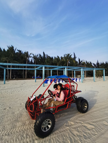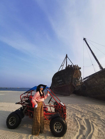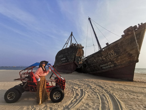热闹的海边尽是我们的欢声笑语还有那些摩托的引擎声,第一次玩沙滩摩托很有意思,大胆的尝试开启这一刻的快乐心情,摩托在渔船的遗迹中穿梭,阳光金灿灿的,让你心动不已。