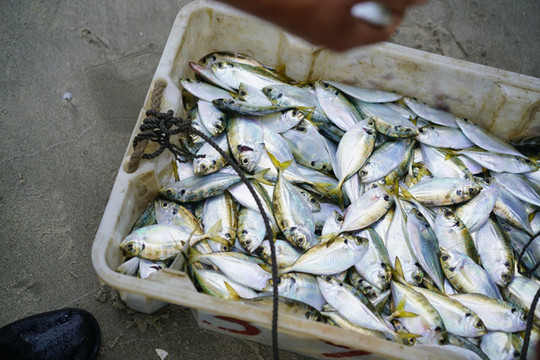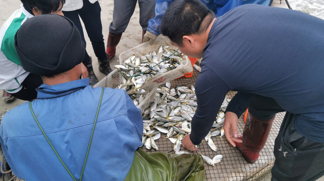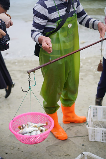 看着渔民从船上来来回回的往岸上带上一箱箱的鱼,一切都如此新奇有趣。沙滩上围着许多人,有渔民、鱼客、巡海人,很是热闹。很多都赶来买新鲜的鱼,偶尔还有虾,我们期待着中午的海鲜大餐,因为这里必定是最鲜美的所在。