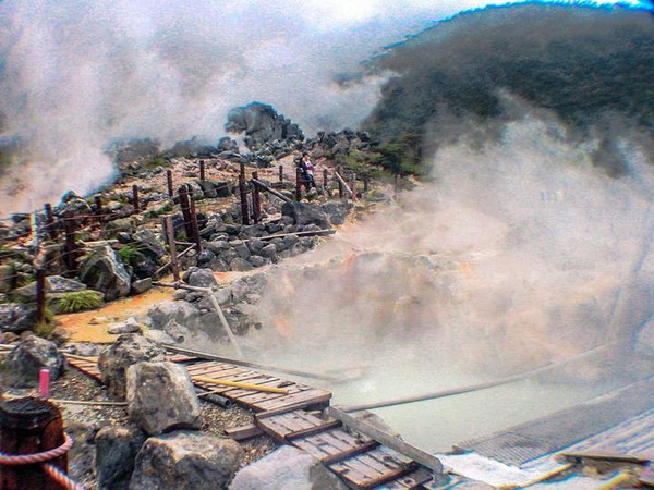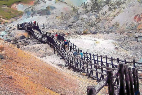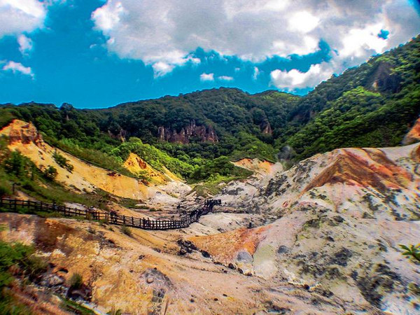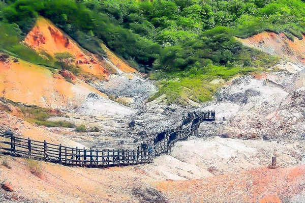 札幌 过去两小时车程不到,就到了犹如地狱一样喷着烟火的山谷,满街散布着硫磺的味道短短几百米的木质栈道,走在其中,整个地狱谷阴森恐怖,离近了就能感受到很浓的硫磺味道,整个山谷就在路边,有一条栈道可以走到深处。