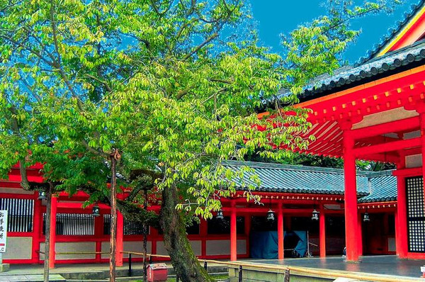 朝堂院内的大殿、配殿前樱花盛开,花瓣被雨水打落,樱花树下的小牌坊上,是来到这里祈福的日本人悬挂的祈福牌,和中国的寺庙相仿,他们将心愿和家人朋友的名字写在牌子上,还可以将自己不吉之事挂在树上,请神灵保佑消灾。神殿里还可以花100日元抽神签,如果抽到"大吉",第二年是一定要回寺庙里还愿。