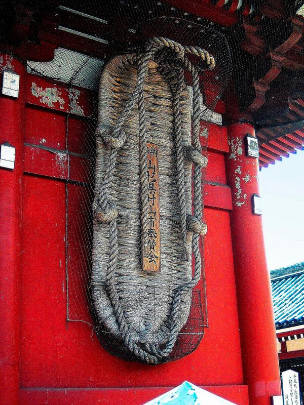 浅草寺的象征是入口处的风雷神门,左右分别是镇守寺院的风神和雷神,大门上挂着写有“雷门”两字的巨大红灯笼,非常气派。门后挂着两个巨大的草鞋。