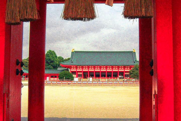 神门"应天门"被涂上了大红色。在"手水所"(为净手心洗手的地方)"净手后,走过神门进入院内,在眼前就展现出"大极殿"的走廊,在位于拜殿左右的楼阁中,东面的称为苍龙楼,西面的称为白虎楼,都是经过对平安京当时的建筑进行严密考证后复原建成的,被指定为京都重点文物。
