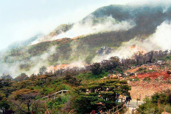 到了白烟袅袅的喷烟地(即阎魔台),能近距离观看大涌谷的山岩和岩缝间喷出的热蒸气,还能看到用温泉煮鸡蛋的过程。因为硫磺含量过高,这里的温泉并不能直接泡。