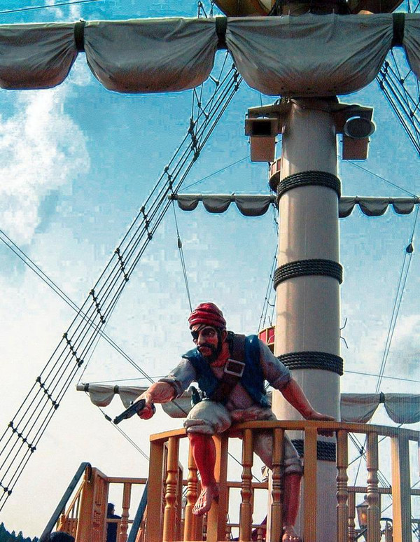 海盗船是专门在景区内建造的海盗船,从外观到内饰,基本都是海盗风格,在电影中看到的海盗船的设计元素可以在这艘船上看到