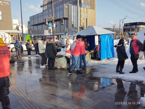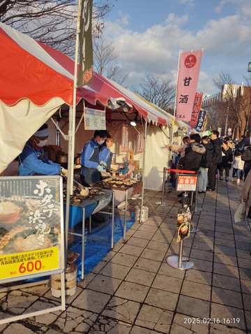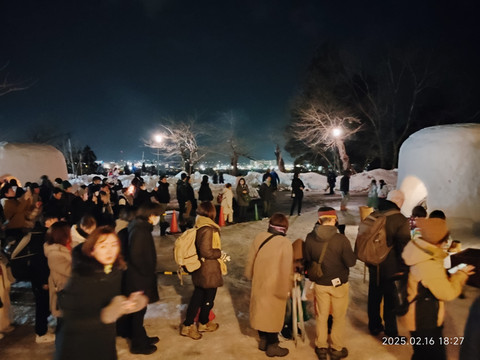 从天守阁下来就准备回去了,因为小城市间往来的火车班次没那么多,特别是晚上,本来准备就是乘坐晚上7点或8点多的那两班。去火车站就打算坐公交了,不想再原路走回去了。在山顶的站台排队等车的人还挺多的,还好工作人员看排队人比较多,安排的班车也比较密,还算是等待得起。好不容易上了车,用英语问到火车站怎么去,这地方虽然偏,车上还有中国人的,直接中文告诉我到不了火车站,要从一个站下车再走10来分钟吧。我们做的这个中巴车估计是专用摆渡车,也没要收费。到站下车后,看到站台还有好多人在排队等乘车,当天人这么多,估计都是这个雪屋节的原因吧。下车的地方旁边又有条街道好多小吃摊看起来挺热闹的,在里面逛了逛,没忍住又吃了些小吃,路过一家超市,也是买了些吃的喝的,用于回去的火车上当晚饭。没多久也就走到火车站了,到了站台本来准备进站的,才发现工作人员举着块牌子,说是去北上市的火车因为中途雪崩取消了。刚听到时,委实有些懵了,这咋好,回不去北上,酒店要花冤枉钱重新订了,而且第二天还要去酒店拿行李赶飞机,估计都要耽误了。站内被影响的旅客还有其他一些,大家都有些茫然。还好工作人员补充说让大家等一等,会安排大巴送大家去北上站。听到这个消息,总算是心里舒了口气,估计日本这边多灾天气,一些应急措施都已经成熟了。这也是第一次碰到这样的意外而影响行程的,看来以后出游时还是要考虑到这种极端意外对旅行计划安排的影响。