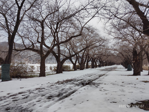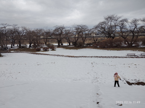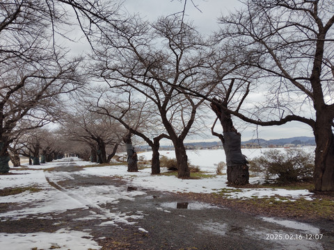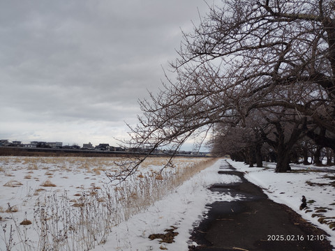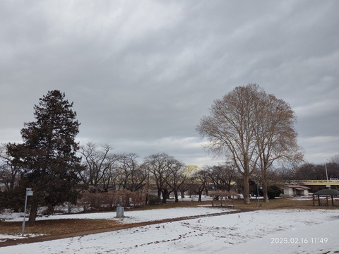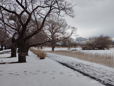 走了不远就有一座过河的桥,桥上只有一边有供行人和自行车的边道,这个设计也是第一次见到,不过的确是很适合行人不多的情况,节省了建设开支。桥另一边下去就是一个开放式公园,有一条沿河的步行道,道路两边遍植樱花树,树干都是很粗的,应该是很有些年头了,河滩上还有些芦苇,·不是有些乌鸦从树枝间飞过,这边乌鸦很多,而且不怕人。公园里有些地方的雪已经化了,露出了下面有些泥泞的路面和一些杂草。好久没遇到这样的雪景了,虽然不如北海道那么名气大,不过感觉还是挺不错的,下次有机会还想再来看看呢。看时间也差不多了,就原路返回了,快到车站的时候还突然下起了雨了,蒙蒙细雨,配着异国雪景,很有一番滋味。