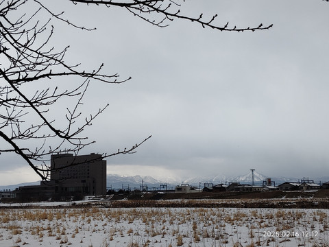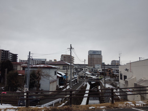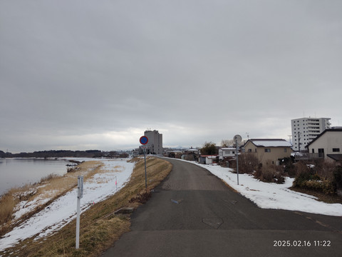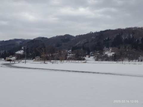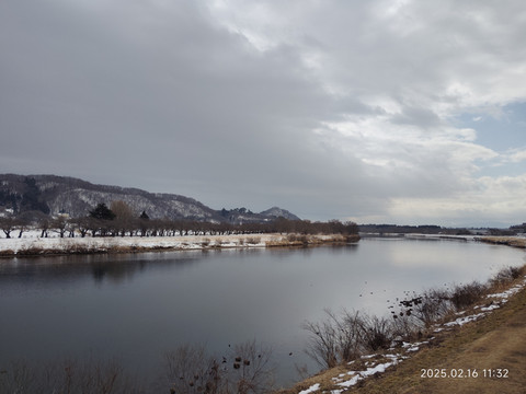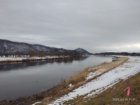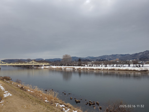 挑了一个可以直达的,班次数量也还可以的目的地车站——横手。火车一个小时车程,车票成人一千多日元,晚上8点多还有车回来。买票的时候,最早的一班也是要到下午一点多的,还有两三个小时,刚好可以出去看看。从地图上可以看到离车站不远就有条河流,我们就准备沿着河流走走看看。走了两三个路口就走到了河岸边,河岸边的风景还是比较开阔的,远处还有些连绵小山,都被白雪覆盖着,河对岸看地图上描述是个公园,我们就准备走过去看看。沿着河岸走,也没碰到几个行人,更别提游客了,所以走的很是舒服。河岸的一边是鳞次栉比的本地人住宅,一栋一栋的,虽不大,看起来却很有感觉。河边有碑刻,原来河叫北上川。河水没有封冻,尚有有一些水鸟在河水中自由嬉戏,河流一直延伸到远方和白雪覆盖的大地连成一片。