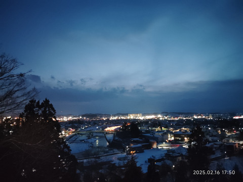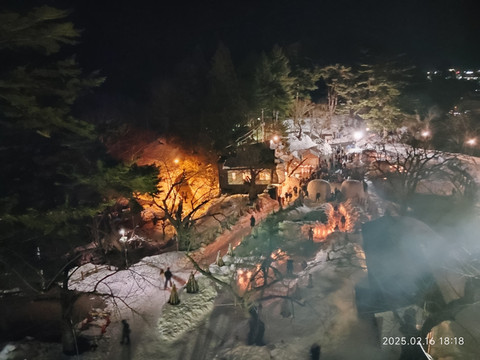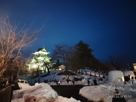 在走过一条横跨河流的大桥的时候,刚好看到其下一幅壮观的画面,因为冬季水少而露出的平坦河床上,摆着密密麻麻的雪灯,这些雪灯上的蜡烛的的火光,点点滴滴点缀了那块河床。在落日的余晖下,只能说是烂漫了。真是为人家的造景能力称赞,又是一个花小钱办大事的活生生案例。桥面上聚集了不少人,很多人都是长枪短跑的架设着,估计在追逐着天黑下来的那一刻的烂漫吧。过了桥,没多久就走到横手城所在的山脚下了,不过从山脚看,上山都覆盖了厚厚的白雪,也不知道上山路在哪儿了,看来导航把我们带到了一个偏僻的上山路。本来都准备放弃了,不过恰好有了几个也是走的这条路,人家就直接从积雪上踩过去了,看起来还有个老人,那我们也不能落后了,人家都能上山,我们当然也行了,而且说是山,其实也就个不到百来米吧。上山原来应该是有台阶的,积雪覆盖了,只能沿着留着的脚印走,有些地方因为踩踏得比较结实反而比较滑,攀爬的格外小心,步履维艰就是说的这样吧,一步一步的着实考验心性。一路走来也就看到几个人从山上下来,我们后面也看不到其他人跟着上山的,上山的时候天已经黑了,山上路上也没什么路灯,幸好白雪覆盖,看起来没那么黑森森的,山顶依稀能看到的灯光也是给了坚持下去的勇气。转了几个弯后,终于在上山路的尽头看到山顶汹涌的人潮,总算是上来了,长舒一口气。