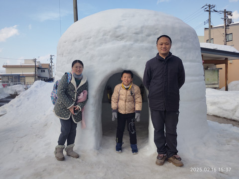 火车是一路西行到横手,一路上都是穿过的山区都是覆盖着厚厚的白雪,偶尔见到的河流都已经结冻了,在太阳照射下闪着光泽。一个小时的车程,穿过不少田野,居民区,山区,也没多久就到达了终点站。横手站还是挺热闹的,看站厅里面的路线图这边也是汇聚了好几条铁路线,算是秋田县内一个比较重要的站点吧,人来人往的,站点里面还有一些临时摆设的摊点售卖当地特产。出站后才发现刚好是当地的雪屋节,战前广场就有好几个用积雪搭起来的大雪屋,有些里面还点着蜡烛供奉了本地一些神灵,好多路人都是被吸引了拍照留影。广场一角聚集了不少人,看起来是本地的青年志愿者社团在举办雪屋节的传统纪念活动,还现做了一些特色小吃分派给路人品尝。大街上还看到有类似巡游的小队伍,扛着一个很大的面具造型在穿街走巷。
