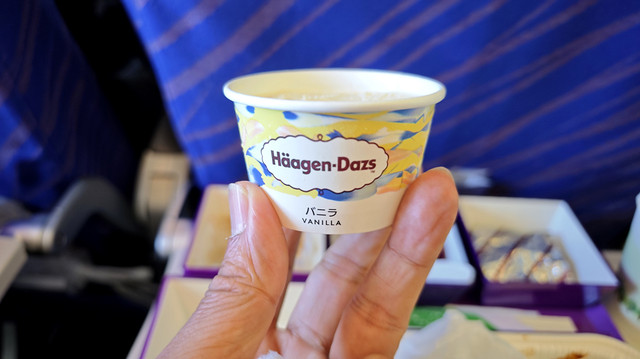 飞机餐后,空姐用托盘盛着哈根达斯雪糕(数量不多,派完就没了)出来,问乘客是否需要,当然要啦!
