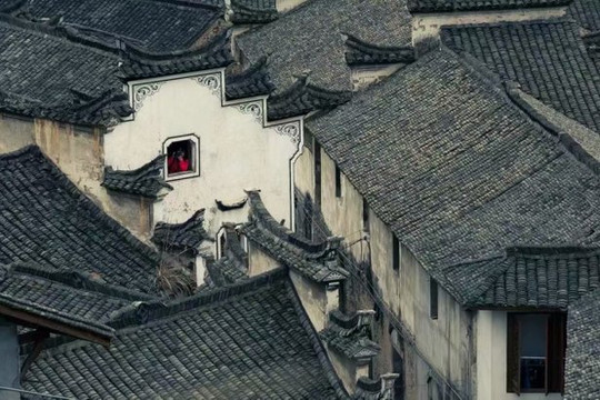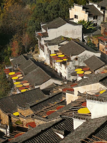 往下行就是天街,徽式商铺林立,前店后坊,一幅流动的缩写版“清明上河图”。家家户户屋顶晒盘云集,绘就出一幅“晒秋人家”风情画。