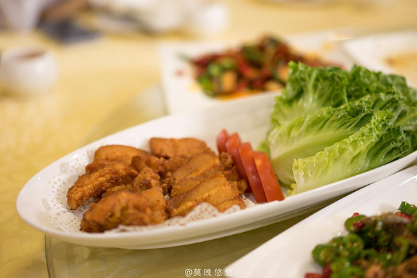 炸过的酥肉,用生菜包着再加入一片西红柿一起吃,很赞。