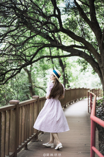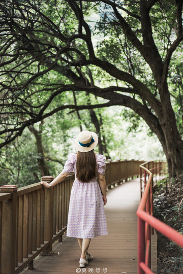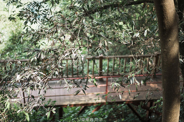 阳光透过树叶斑驳地洒在木栈道上,看着十分治愈