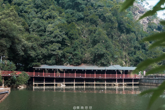 谷底里一个碧绿的湖,边上建有古香古色的建筑,看着倒是有几分古侠剧里场景的气息。