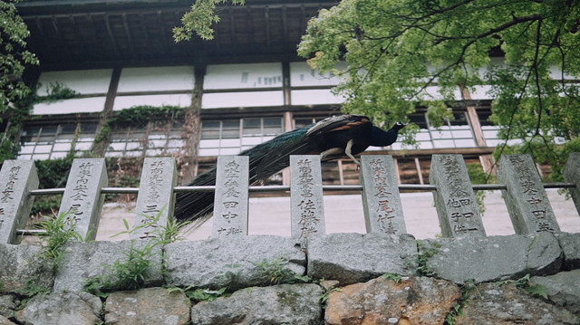 寺院比想象中宽阔,夏天的风吹来雨水,轻落在脸上,凉凉的。屋檐下路过一只孔雀,步履悠闲,怡然自得。