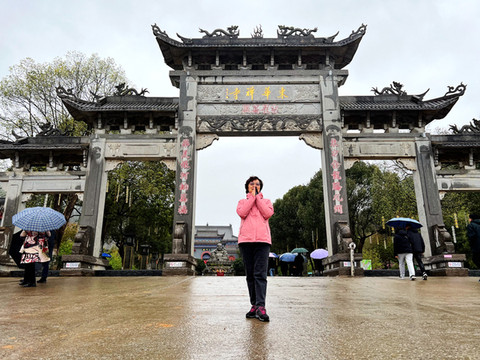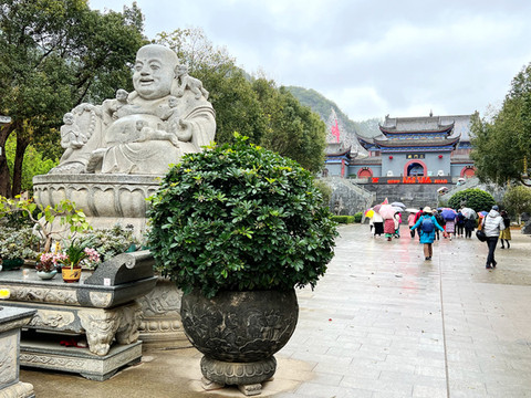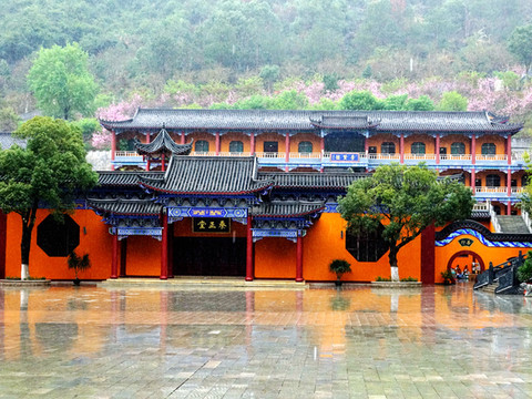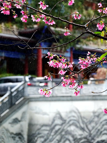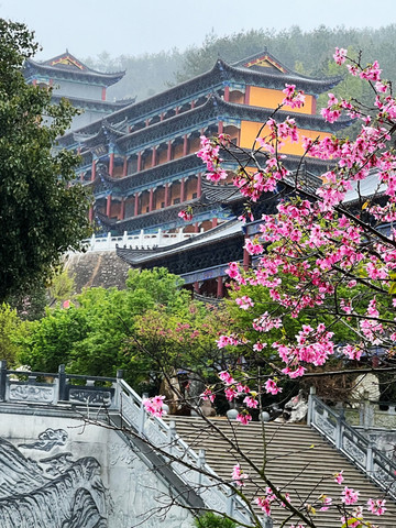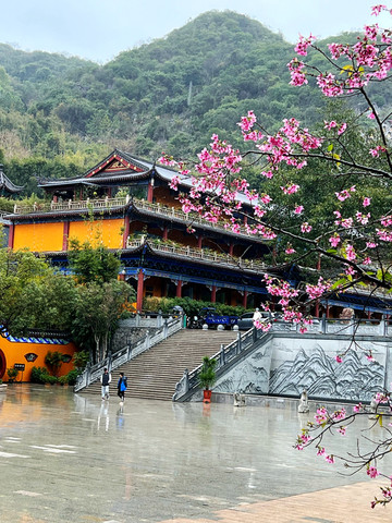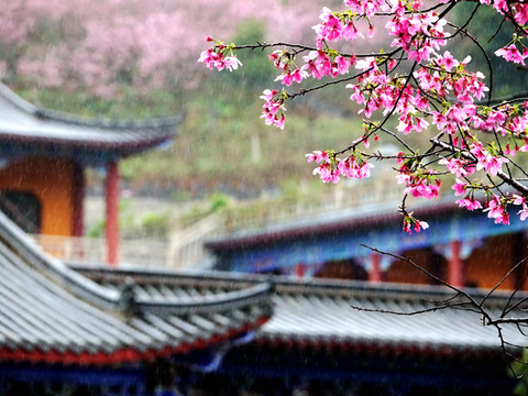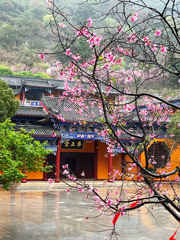 冒着雨我们走进了寺门,雨中的寺庙似乎更为清净,游人不多。寺内的桃花点缀了那一座座严肃的大殿,更加柔和富有意境。