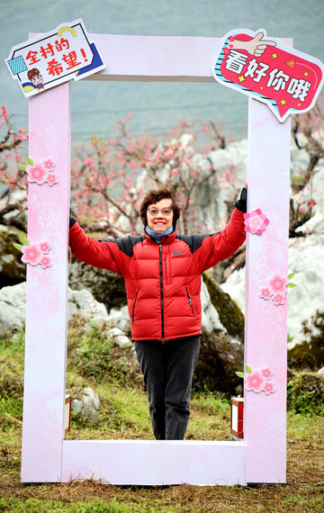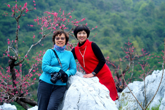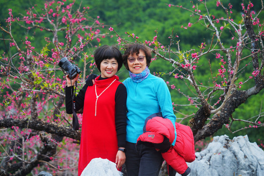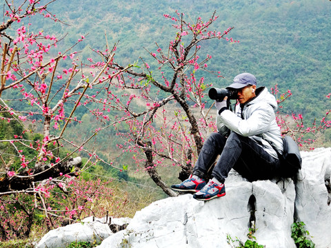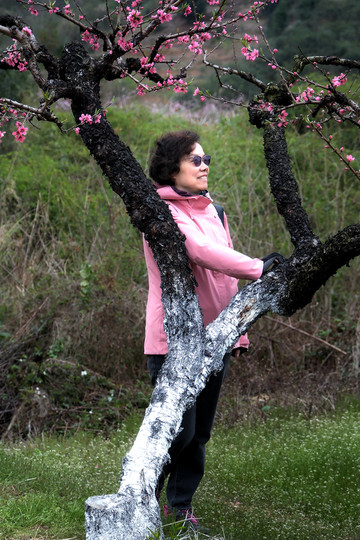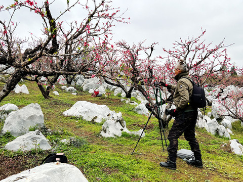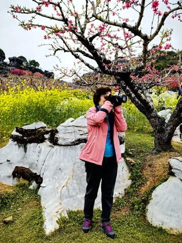 我沉湎其中,却无从下手,不知道该怎样拍,才能记录下这美妙瞬间?尝试着跨过一块块白石头,绕着一棵棵桃树观看揣摩,拍摄的结果却并不如意。但人在其中效果却出奇的好(出自大师之手)。